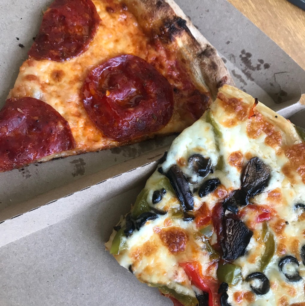 Como não se apaixonar por um pedaço de pizza super bem feito, e ainda sabendo que eram orgânicos do início ao fim? Me lembrou até aquela pizzaria inglesa, que comemos em Oxford (sobre a qual escrevi nesse post aqui).