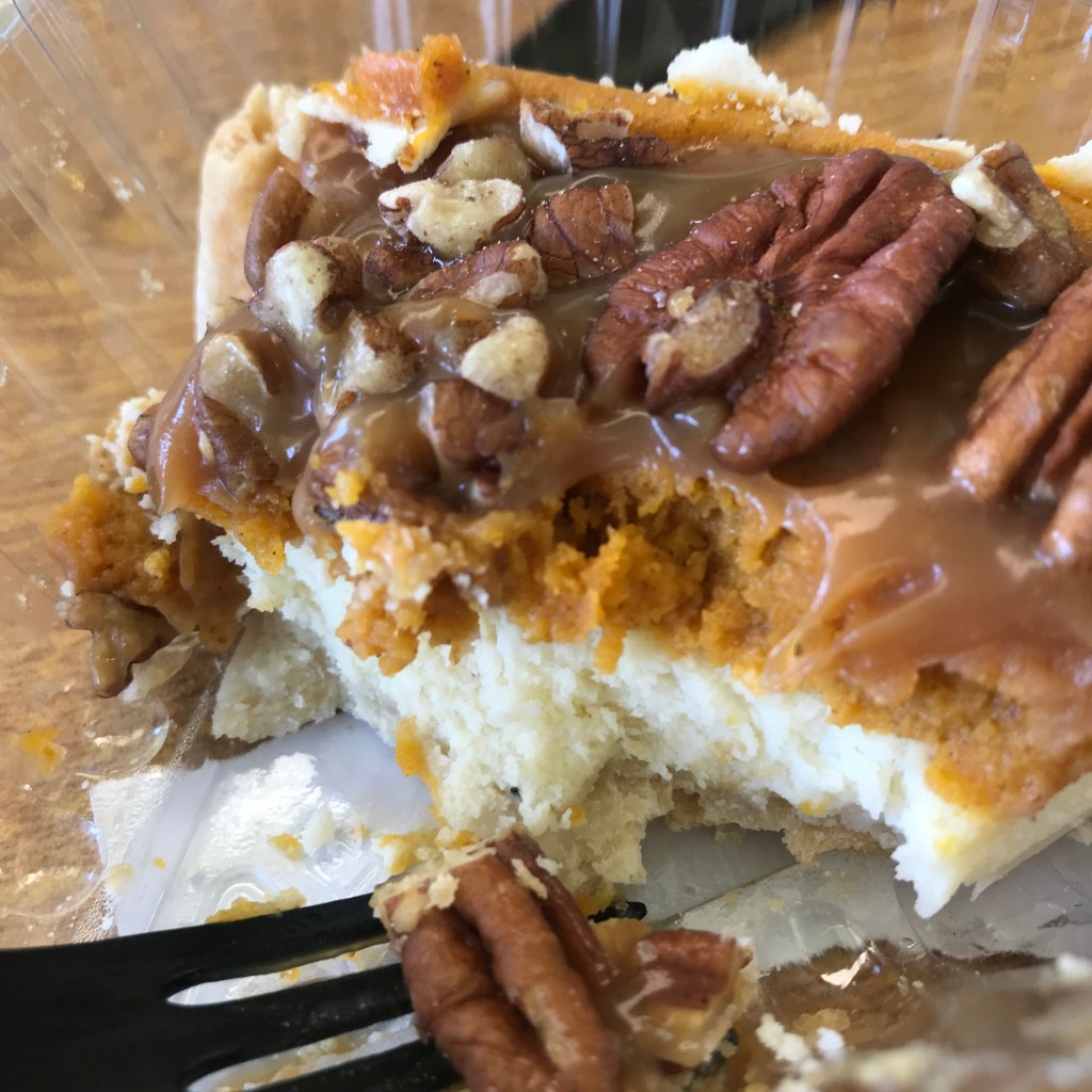 Na cafeteria gracinha deles, essa maravilhosidade que era o cheesecake de pumpkinspice: massinha amanteigada, purê de abóboras com sabor de especiarias, o creamcheese, uma cobertura de caramelo salgado e noz pecã por cima!