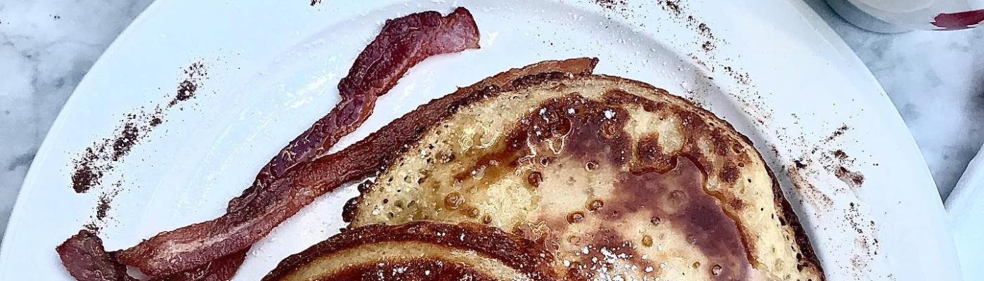 Não teve nem como, né? Meu primeiro café da manhã americano foi composto de panquecas com maple syrup, bacon, suco de laranja e café americano. Eu saí andando do local onde estava hospedada, vi o mezanino de um hotel super simpático anunciando esse menu por algo como 12 dólares.
